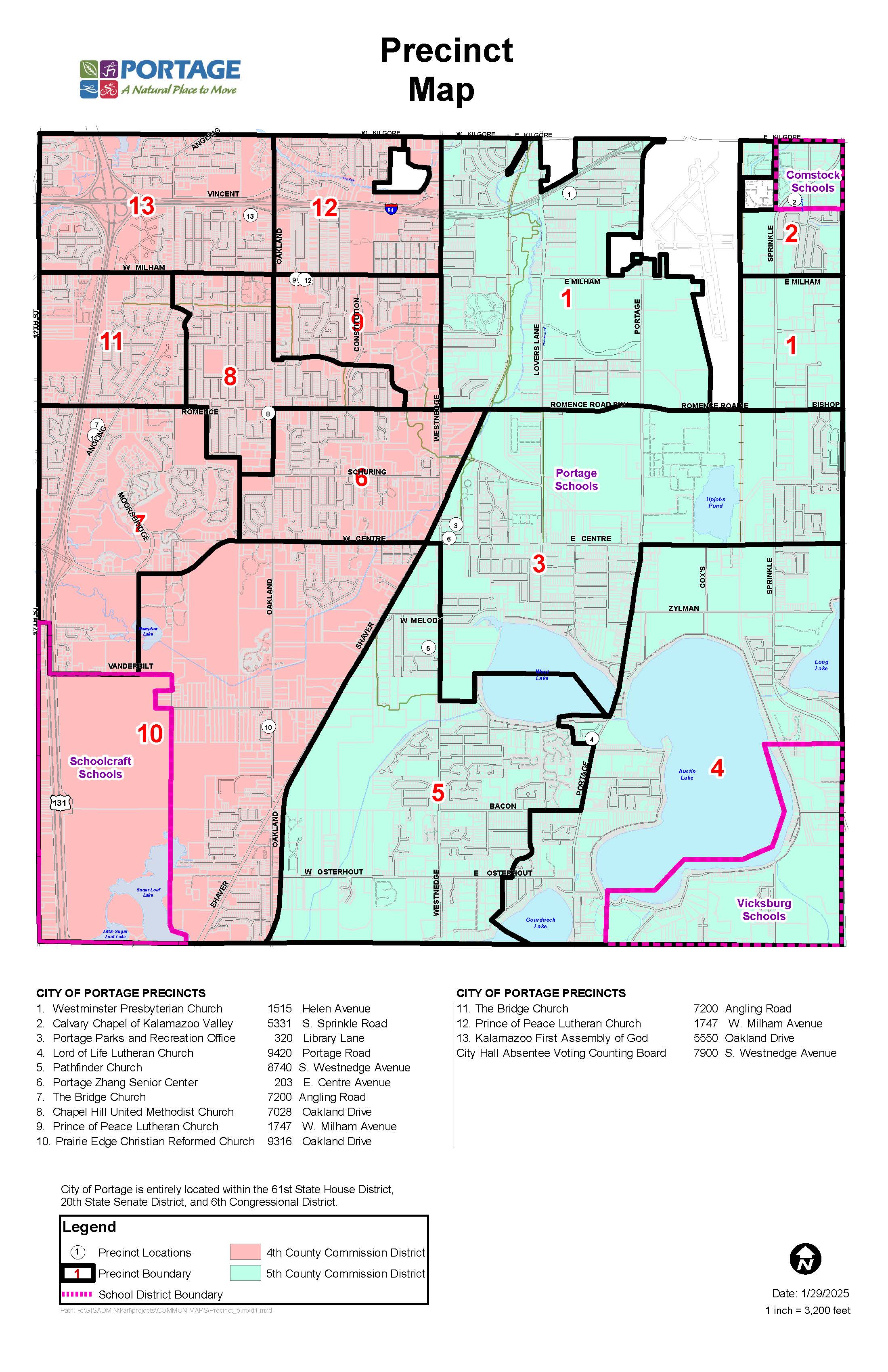 Portage is divided into 13 precincts, each with its own polling place. Polls are open from 7 AM to 8 PM on every Election Day.