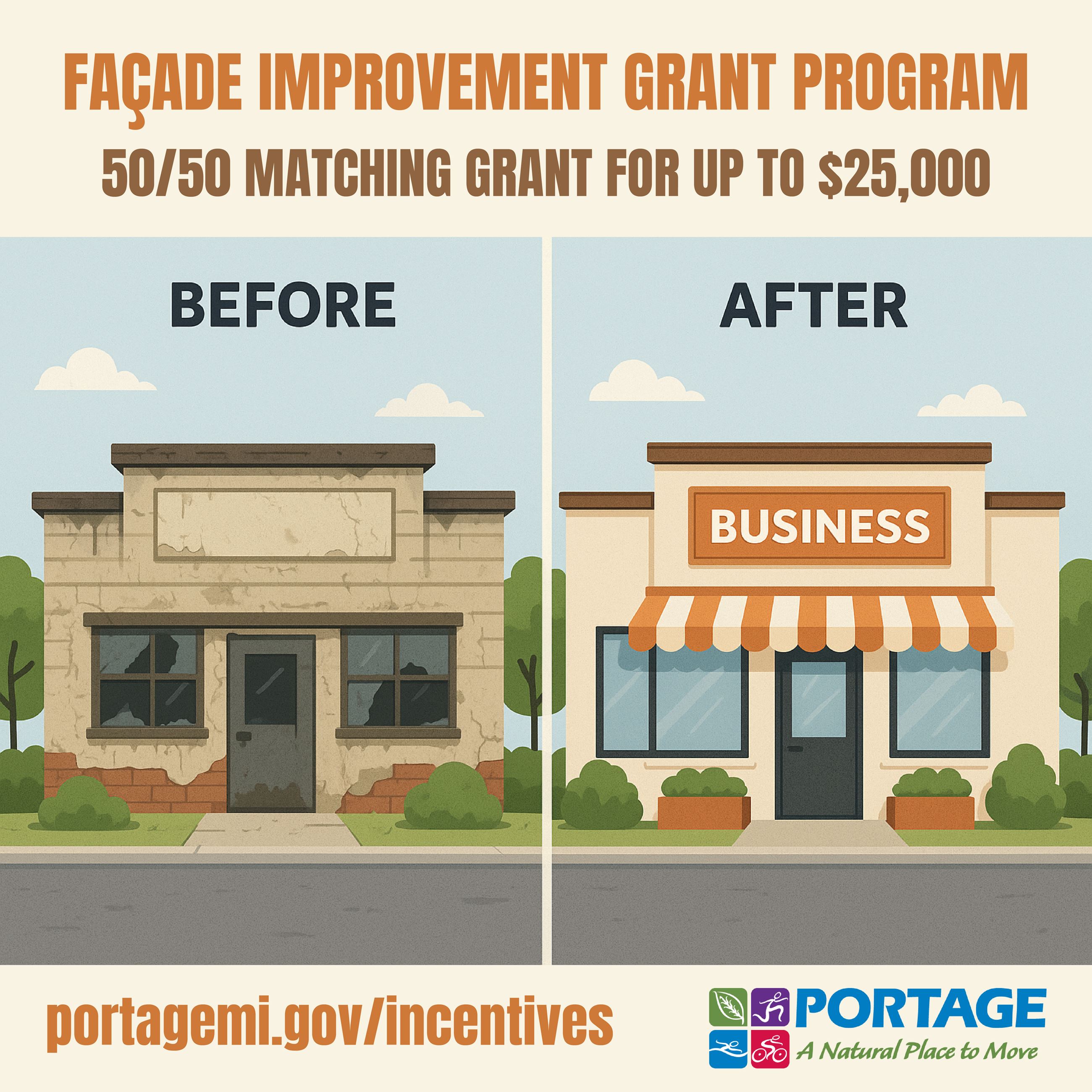 Commercial (retail, service, office) properties within the City of Portage can upgrade their facades, landscaping, and associated improvements on street-facing lots with the Façade Improvement Grant Program. This is a 50/50 matching grant for up to $25,000 for qualified project costs. In addition to the matching funds, the city will reimburse up to $2,500 in architectural fees for approved projects with no match required. This is a competitive grant program available for non-residential properties within the City of Portage boundaries.