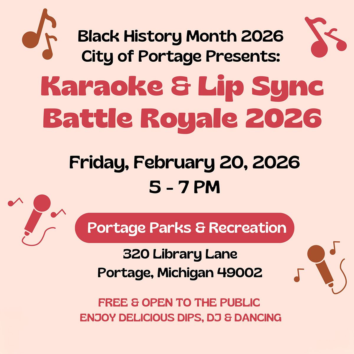 Last year, we celebrated Motown Hits. This year, we're turning up the energy. Join the City of Portage for a special Black History Month Karaoke & Lip Sync Battle Royale on Friday, February 20, from 5 to 7 PM at Portage Parks & Recreation, 320 Library Lane. DJ Conscious will be spinning tunes all evening - dancing is strongly encouraged. Enjoy complimentary refreshments from Phence & Post. The event is FREE and open to the public. No registration is required.